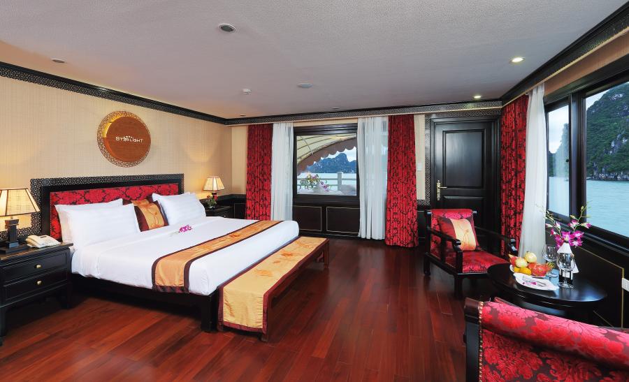 The Halong luxury cruise is proud of the elegant-appointed public areas include a restaurant, two lounges, a library, a gift shop, a spa and a wine cellar. The expansive Sundeck is a haven for relaxation; where passengers mingle into unforgettable Halong Bay scenery on comfortable longer chairs while enjoying a cool drink served from the Uranus Bar. The concept of Starlight Cruise is distinguished from others with the definition of ultimate luxury. We believe that “luxury” should and must be built from every single aspect of a cruise trip, from modern facilities, professional and delightful hospitality onboard, exquisite cuisine, delicate dinning services, exciting excursions and entertaining, etc. Among which, caring, helpful and friendly staffs are the ambassadors of the luxury.
