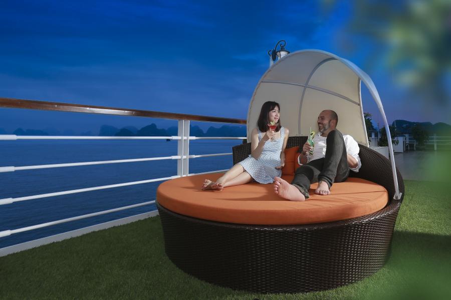 Mon Chéri Cruise offers 18 stylish cabins alongside the elegant restaurant and bars, fitness facilities and spa service. The cruise provides 5-star standard services with professional staff to guarantee that can satisfy even the most demanding guests. In addition, we absolutely serve the Western and Asian cuisines, and Mon Chéri Cruises is the first boat in Halong bay having an separated kitchen for Halal foods which are cooked by foreign Chefs with well-equipped Halal Cooking Certification.